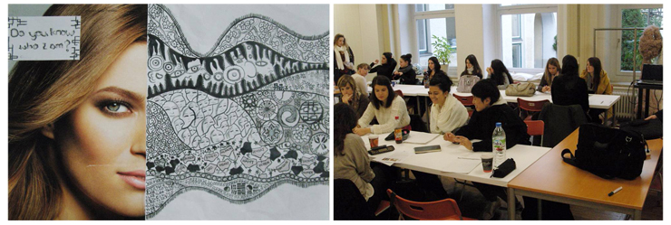 알리스 선생님의 스틸리즘 시간에는 코트 복종의 image map과 inspiration 페이지 구성을, 기 다른 4개의 사물을 주고, 3개씩 디자인을 하는 수업이 이어졌는데, 이 때 뮌헨 에스모드에 와서 처음으로 밤샘 작업을 하게 되었다. 책상도 없는 내 방에서, 무릎을 책상 삼아 컬러링을 하는 불편한 상황에서도, 그렇게나 자신없어 움츠렸던 드로잉과 일러스트를 어느덧 내가 즐기고 있다는 사실을 깨닫게 되어 기뻤고, 그래서 그런지 밤을 새가면서 시간내에 과제를 제출할 수 있었다. 이 주간에 뮌헨에서 캐주얼 소재 박람회가 있었는데 교장 선생님 이하 2학년 담당 선생님, 학생들과 다 같이 박람회장을 방문해서 현지 가이드를 통해 최신 캐쥬얼 섬유 트렌드에 관한 설명을 들었다.
