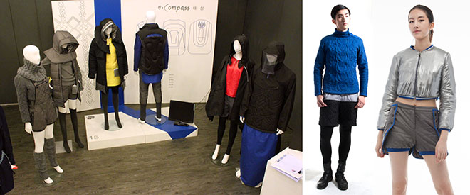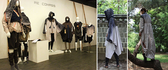 'e.Compass'라는 브랜드 네임은 earth, energy, emotion을 의미하는 'e'와 방향을 제시한다는 뜻의 'compass'를 결합해 만들었다. 옷에 태양열판을 부착해 핸드폰 충전이 가능하며 기능성 소재인 체열반사 소재를 안감으로 사용해 보온성을 30% 높였다. 에어쿠션 칼라를 달아 목 베개로, 등판에 솜을 넣은 아이템은 등받이로도 쓸 수 있다. 조끼는 접이식 의자로, 판초는 그늘막으로, 가방을 해체하면 앞치마로, 이너웨어는 발목을 덮는 가벼운 침낭으로 변형되는 것이 특징이다. 스냅단추와 스트링을 조정해 다양한 볼륨과 스타일 연출이 가능하다. 풀밭에 앉거나 간단한 캠핑이 가능하도록 기능적 요소를 갖추었으면서 동시에 니트 짜임에서 보여지는 무늬를 누빔 스티치로 만들어 디자인적으로도 훌륭하다. 누빔 스티치 사이에 숨어있는 수납공간도 포인트.