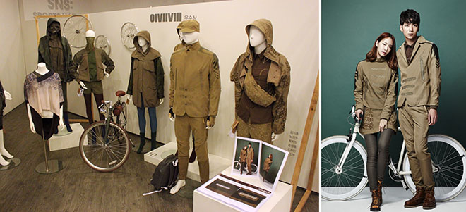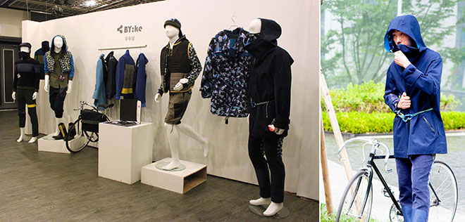 자전거로 출퇴근하는 자출족들을 위한 남성용 바이크 브랜드. 아우터 밑단을 길게 디자인해 라이딩시 언더웨어가 보이지 않도록 했고 베스트 뒷면 안감에는 스카치 반사 소재를 사용해 야간 라이딩시 안정성까지 고려했다. 힙과 종아리 안쪽에 스트레치 원단을 쓰고 무릎 안쪽에 트임을 주어 편안하게 자전거를 탈 수 있게 했다. 스트링을 조여 바지단 길이를 조정할 수 있어 페달링도 용이하다. 하운드투스 체크를 카무플라주와 믹스해 프린트를 개발했고 직선적인 느낌의 패턴으로 누빔을 해 매니시함을 더했다. 가방은 자전거 프레임에 탈부착할 수 있고 뒤집으면 서류가방처럼 사용할 수도 있다. 우천시 바지와 신발을 보호하는 방수 신발덮개까지 제작했다.