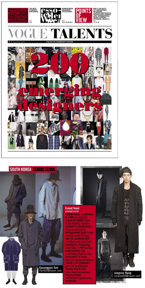 2014 VOGUE TALENTS 특별판에는 이탈리아 Domus Academy, Polimoda, Marangoni, 영국 Central Saint Martins College, Royal College of Art, 벨기에 Antwerp, 미국 Parsons, Pratt Institute 를 비롯, 네덜란드, 스웨덴, 스위스, 호주, 일본 등 전세계 유명 패션학교 45개의 졸업작품이 실렸다. 에스모드 파리와 에스모드 베를린이 각각 프랑스와 독일을 대표하는 패션학교 중 하나로 선정되었으며, 한국에서는 유일하게 에스모드 서울이 소개되었다.