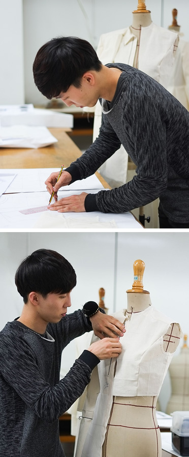 A. 안녕하세요, 에스모드 서울 1학년에 재학중인 김선국 입니다. 어릴 때부터 옷에 관심이 많아서 쇼핑을 하고 옷을 입어보는 것을 좋아했습니다. 그냥 단순이 ‘옷’이 좋았어요. 그래서 문득, ‘이렇게 내가 좋아하는 옷을 직접 만들어 입으면 좋겠다’라는 생각을 하게 됐습니다. 디자이너란 직업에 대한 동경은 그 때부터 시작되었던 것 같습니다. 하지만 고등학교 졸업 후 진로를 경영학으로 선택하게 됐고, 흥미 없는 공부를 하며 방황하는 시간을 많이 보냈습니다. 에스모드 서울에 입학하기 전까지 말이죠.