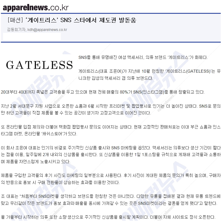 2017년 9월 11일「어패럴뉴스」에 게재된 26기 졸업생 조윤여(여성복 전공) 동문의 게이트리스(GATELESS) 기사 입니다.