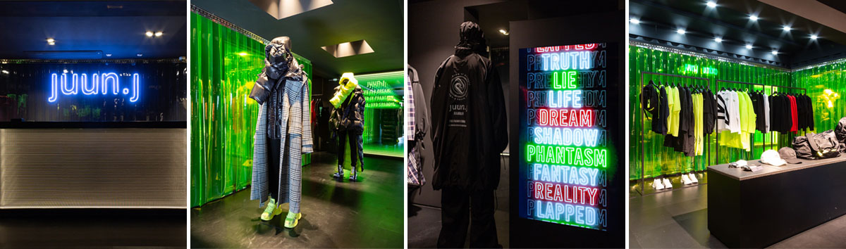 컬렉션은 준지를 대표하는 블랙 컬러와 이번 F/W시즌 시그니처 컬러인 네온으로 구성했으며 네온사인 아티스트 윤여준 작가와 협업한 아트워크도 함께 전시했다.