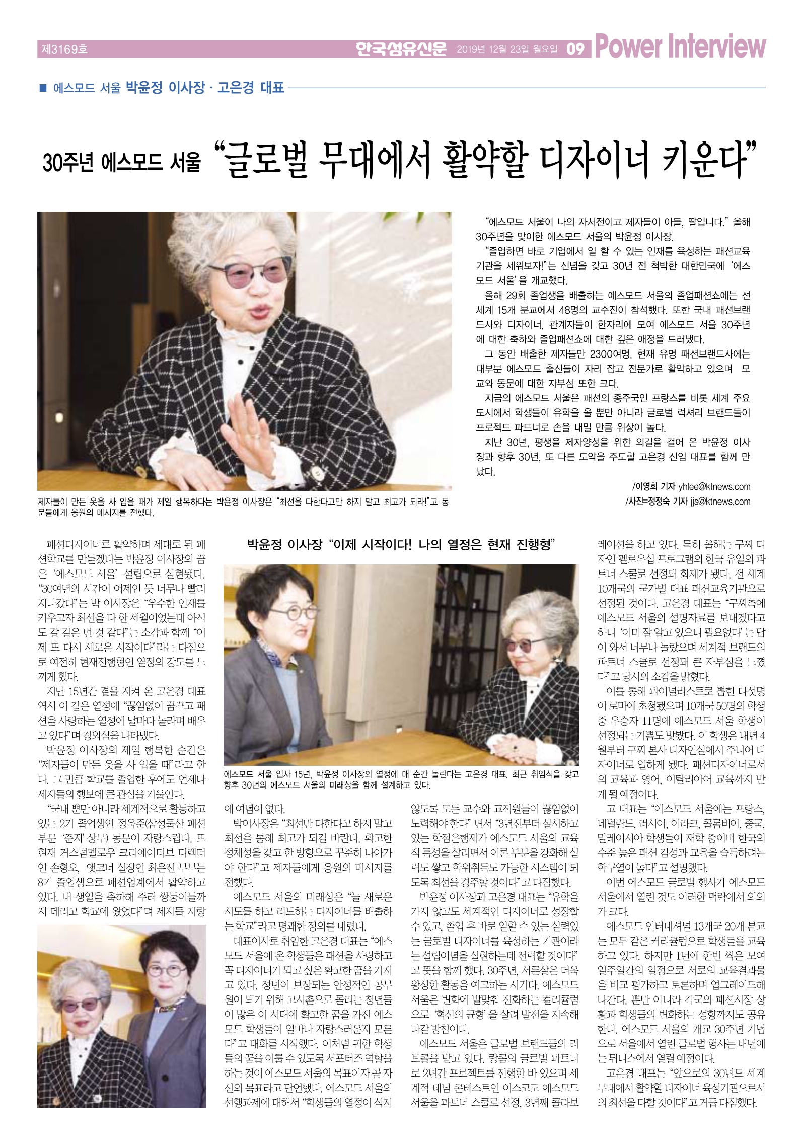 [섬유신문] 박윤정 이사장·고은경 대표 인터뷰 "글로벌 무대에서 활약할 디자이너 키운다"