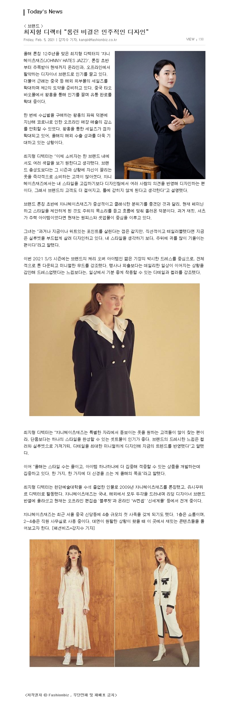 • 내용: 에스모드 서울 10기 최지형 동문의 브랜드 쟈니헤이츠재즈(JOHNNY HATES JAZZ). 올해 론칭 12주년을 맞은 쟈니헤이츠재즈 소식이 패션비즈에 실렸다. 온오프라인에서 큰 인기를 끄는 것은 물론, 중국 등 해외 외부몰의 세일즈를 확대하며 제2의 도약을 준비하고 있다고. 롱런 비결에 대해 '민주적인 디자인'을 언급한 동문의 소식이다.