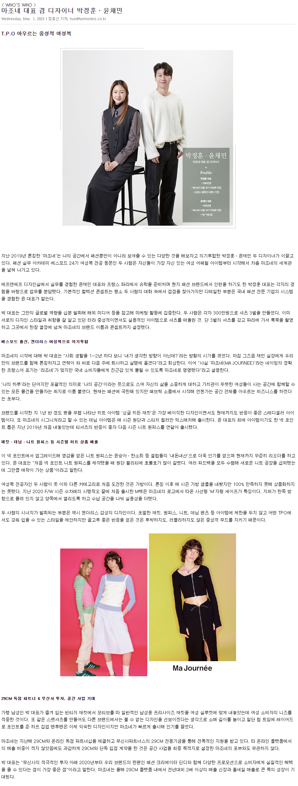 • 내용: 에스모드 서울 박정훈, 윤채민(24기 / 여성복 전공)동문이 런칭한 브랜드 '마조네'가 2023년도 패션비즈 3월호에 소개되었습니다.