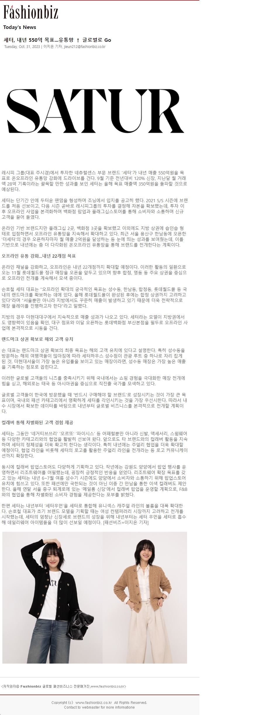 • 내용: 남성복을 전공한 손호철 동문(26기)이 론칭한 브랜드 SATUR(세터).